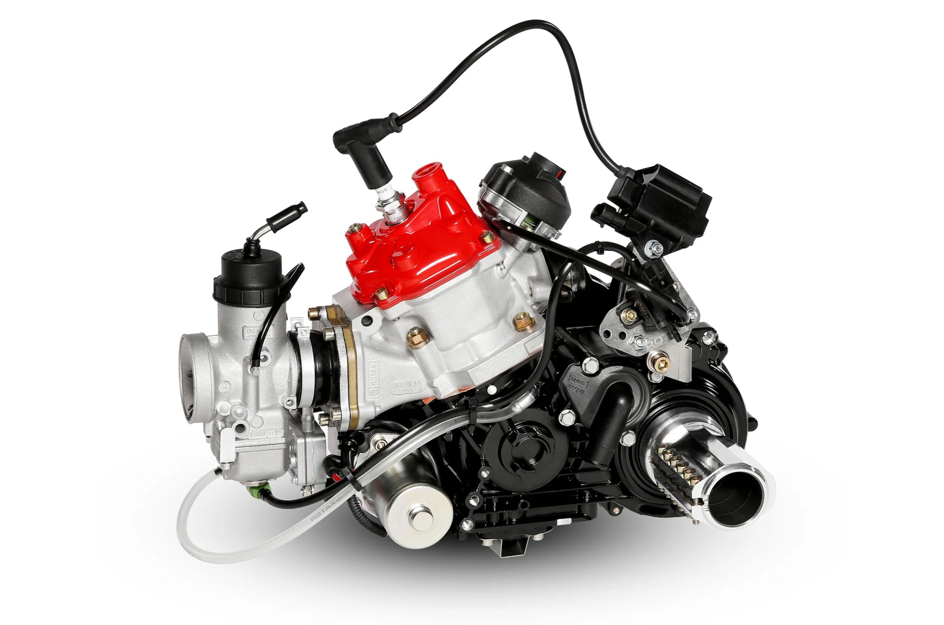 Special features include the chainless drive, electronic shifting assistance, an electronically controlled exhaust valve, electric starter, integrated water pump, and a balanced, water‑cooled 2‑stroke package. The power pack includes intake silencer, carburetor, fuel pump, engine, exhaust system, radiator, battery box with cover, wiring harness, OFF/ON/START switch, and relay.